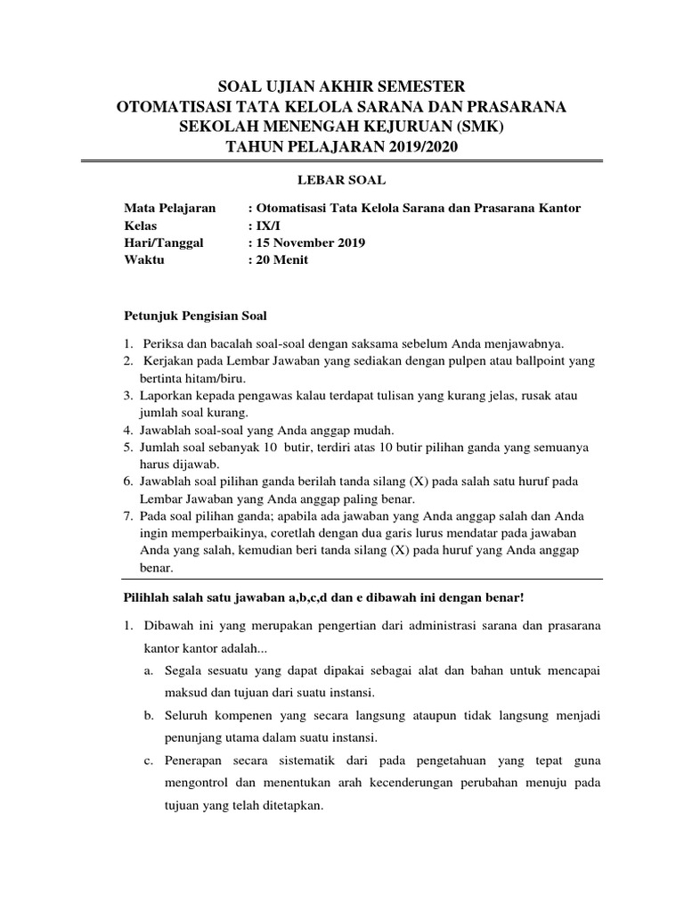 Soal dan kunci jawaban sarana dan prasarana pengadaan adm.perkantoran soal pilihan ganda 1. Bank soal smk sarana prasarana lengkap 1. Pada hari ini admin akan memberikan gratis seluruh kunci jawaban dari semua mata pelajaran lembar kerja siswa ini. Ringkasan materi energi dan daya listrik. Kelas xi sarana dan prasarana 1 soal soal evaluasi pdf is the indonesian regulation of standard level of. Download rpp otomatisasi tata kelola sarana dan prasarana smk kelas xi xii kurikulum 2013 revisi 2017 2018 semester ganjil dan genap jurusan perkantoran otkp. Sekaitan dengan penerapan silabus otomatisasi tata kelola sarana dan prasarana baru dapat diimplementasikan pada saat siswa atau peserta didik kelas x tahun ajaran 20172018 telah naik ke kelas xi dan kelas xii pada tahun pelajaran 2018 2019. 4 responses to latihan soal otomatisasi tata kelola keuangan unknown 6 desember 2018 0553 blog ini sangat membantu kegiatan pembelajaran dengan adanya kuislatihan soal apalagi jika tampilan kuis nya dibuat lebih menarik maka akan menambah. Menjelaskan pengertian administrasi sarana dan prasarana. Materi administrasi sarana dan prasarana. Kunci jawaban otomatisasi tata kelola sarana dan prasarana kelas 11 kunci jawaban from tse2.mm.bing.net soal pkn kelas 12 dan kunci jawaban. 2 otomatisasi tata kelola sarana dan prasarana kelas xi untuk smk/mak peta konsep setelah kita mempelajari materi 1 ini, peserta didik diharapkan dapat: Contoh soal sarana dan prasarana kelas 11 beserta jawabannya.